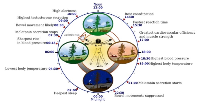 Your biological clock has to be aligned with your lifestyle. An unaligned biological clock can quickly disrupt our performance and health. See what happens with the jetlag syndrome [18]: travelling to different timezones causes very evident effects on each body system in a short timeframe: not falling asleep; nausea; brain fog; lethargy; sudden hunger OR complete lack of hunger etc.