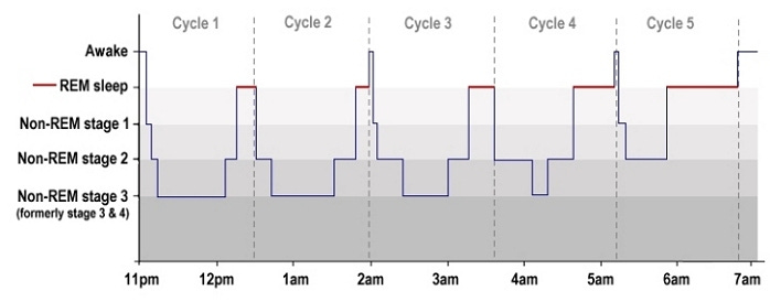 On average, individuals who are over the infancy state (2+ years old) experience 4–6 REM phases each night of sleep. Each full sleep cycle (N-1 => N-2 => N-3 => REM) lasts 90 minutes.